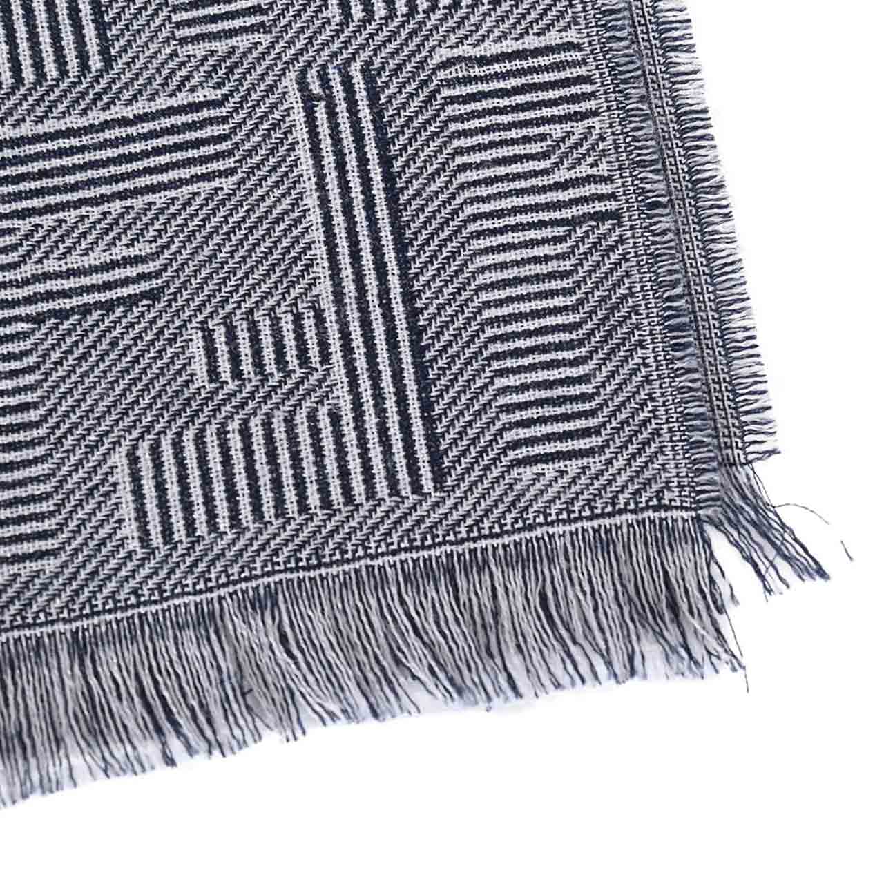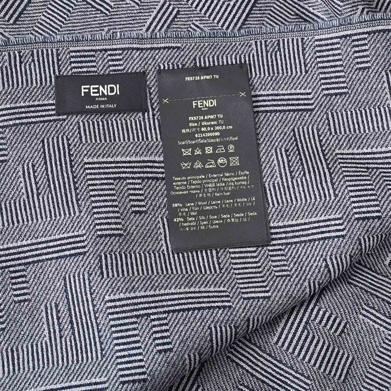 オフィシャルサイトでの紹介コメント 『ウールとシルクの混紡素材を使用し、全体にブルーのフェンディ シャドーのモチーフをあしらった長方形スカーフ。縁はフリンジ仕上げ。』
